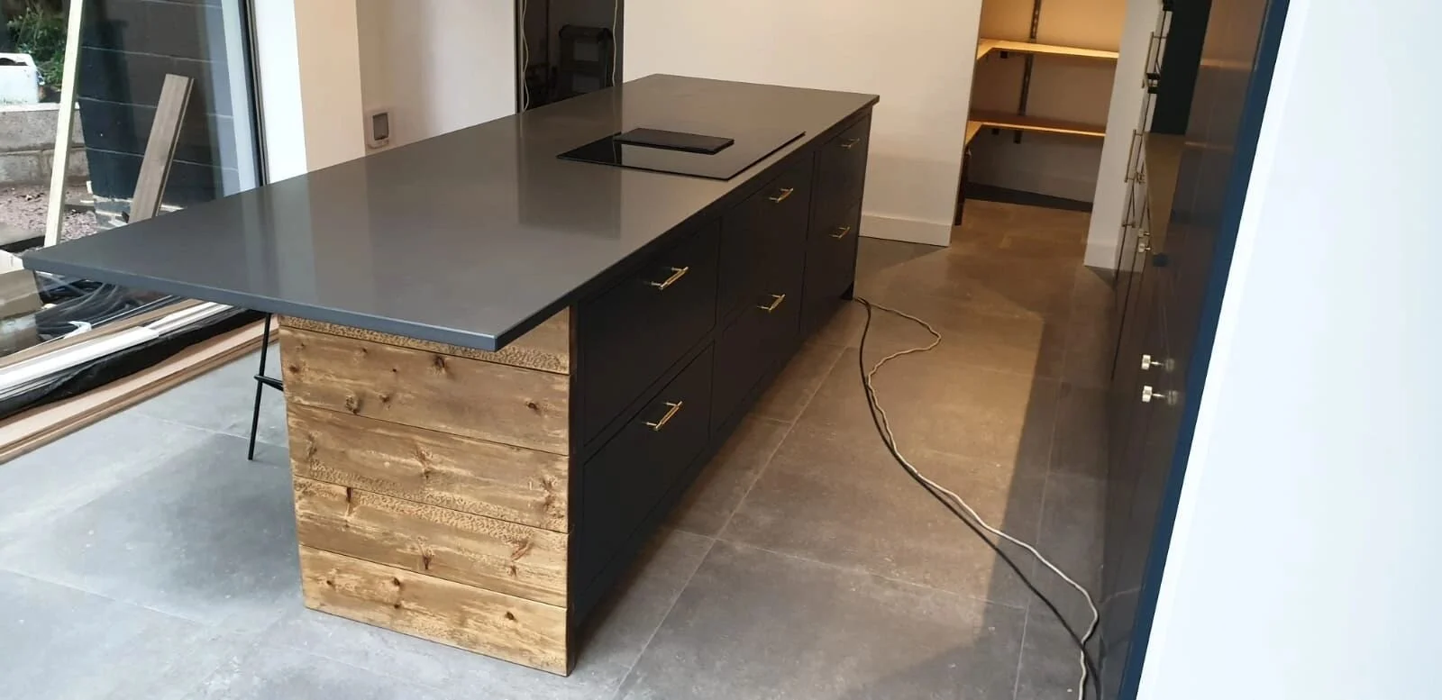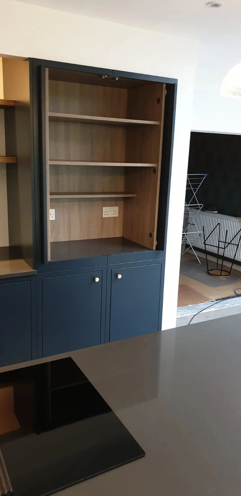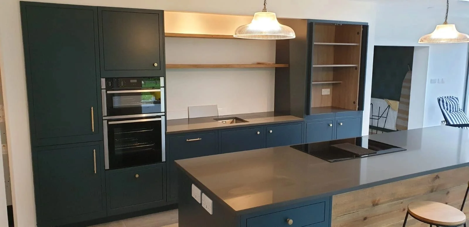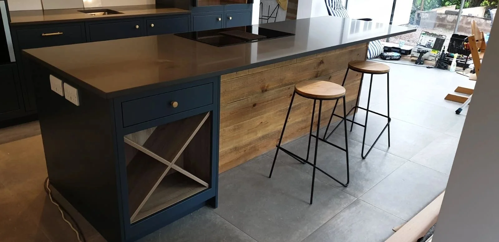 Our customers wanted to achieve a traditional/Modern look and with the stunning slab painted, in-frame door, we could give them everything they wanted. This kitchen features a custom made pocket door system to hide away the mess of coffee and tea making! We have also made rustic timber panels for the island and we can't get enough of them!